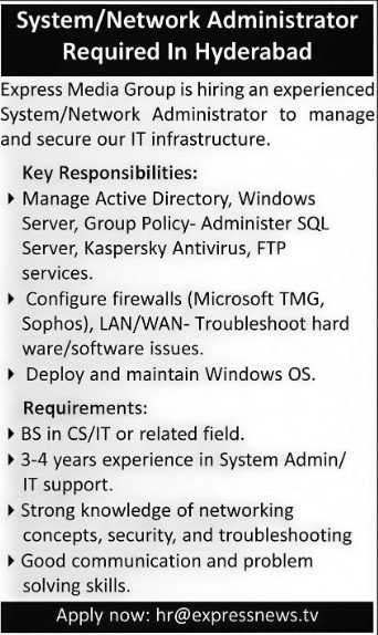 Both male and female candidates can apply for this Express Media Group Jobs Qualification /Experience Required: BS in CS/IT or related field. 3-4 years of experience in System Admin/ IT support. Strong knowledge of networking concepts, security, and troubleshooting. Good communication and problem-solving skills, and more experienced candidates should apply within 10 days.