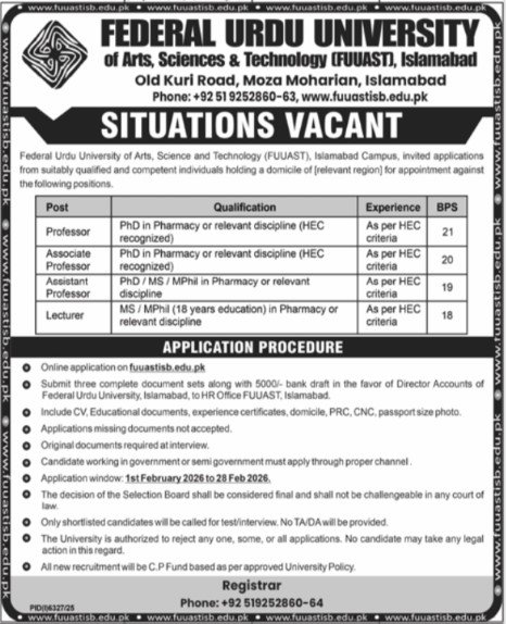Only male candidates can apply for these University Jobs 2026. Qualification /Experience Required: PhD in Pharmacy or relevant discipline (HEC recognized), PhD/MS/MPhil in Pharmacy or relevant discipline, MS/MPhil (18 years of education) in Pharmacy or relevant discipline, and more experienced candidates should apply before 28 February 2026.