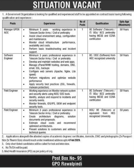 Candidates, if you are seeking the Government Organization Jobs 2026 In Rawalpind,i Apply Now if yes. It would be best if you tried to complete reading this Government Organization Jobs 2026 because you can easily apply for these vacancies: Manager GPON NOC, Software Engineer, Field Engineer, and Field Engineer.