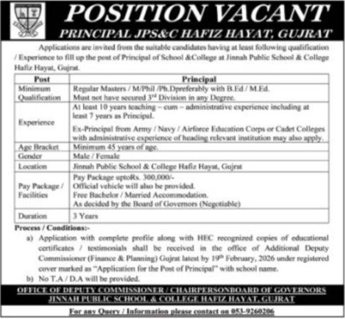 Candidates if you are seeking the Jinnah Public School Jobs 2026 In Gujrat, Apply Now if yes. It would be best if you tried to complete reading this Jinnah Public School Jobs because you can easily apply for these vacancies, Principal.
