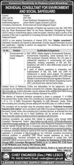 Candidates, if you are seeking the Lahore Electric Supply Company Jobs 2026, Apply Online if yes. It would be best if you tried to complete reading this Lahore Electric Supply Company Jobs because you can easily apply for this vacancy, Environment and Safeguards Expert.