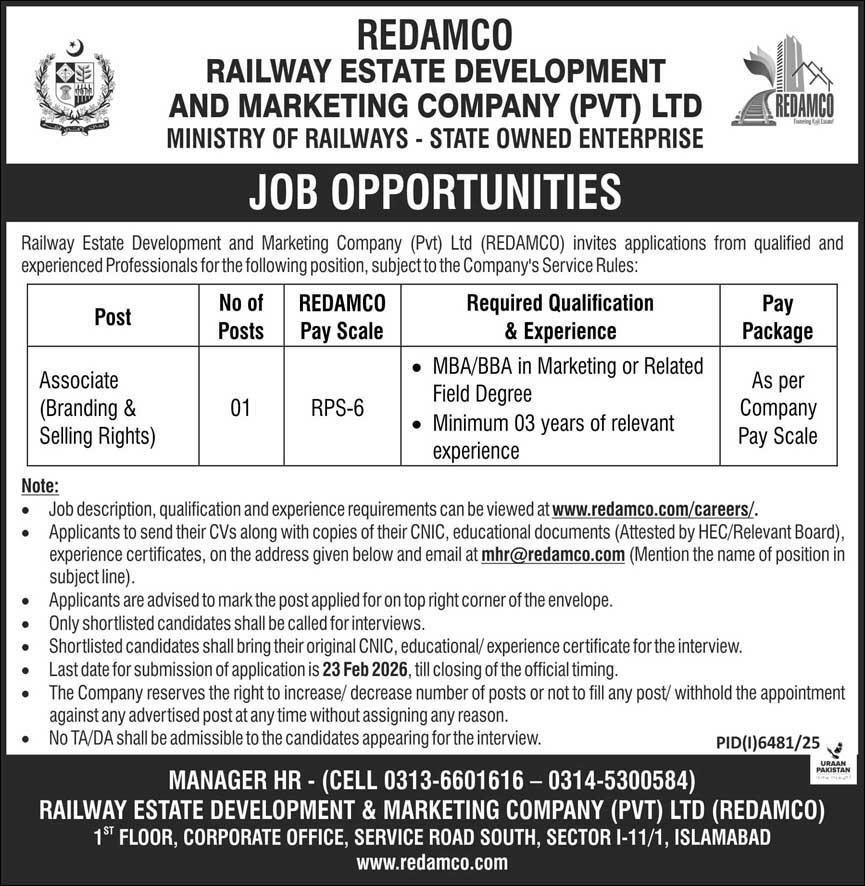 Only male candidates can apply for this Ministry of Railways Jobs 2026 Qualification /Experience Required: MBA/BBA in Marketing or Related Field Degree Minimum 03 years of relevant experience, and more experienced candidates should apply before 23 February 2026.